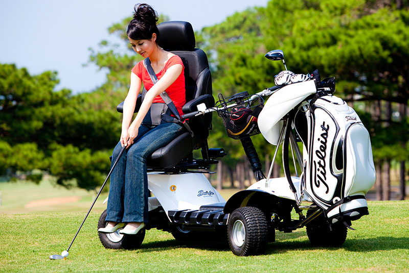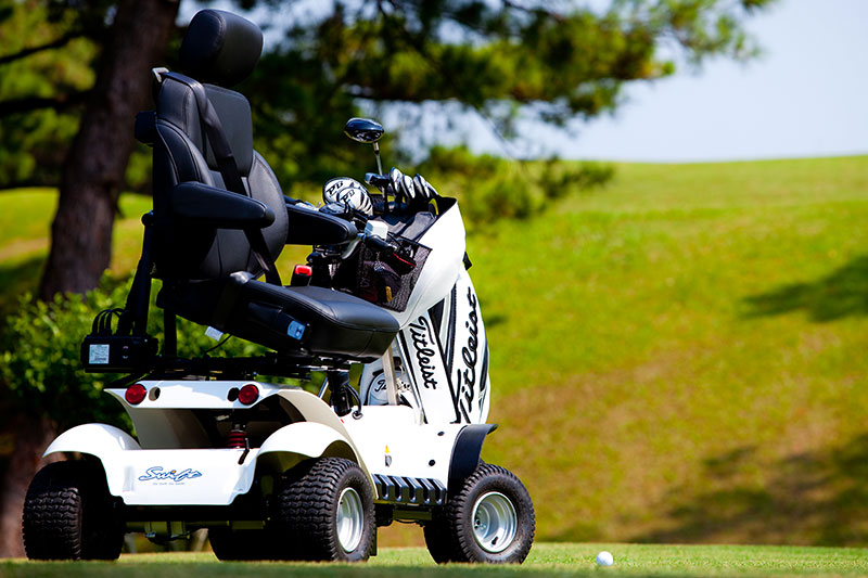 提供殘障人士坐在車上,享受高爾夫球揮桿和推桿. Provide people with disabilities, Sitting on the chair swing and putt.